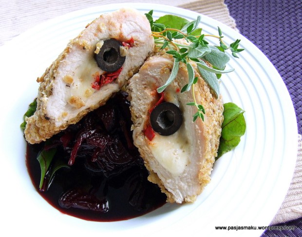 - Oprószamy solą i pieprzem z każdej strony, kieszonkę wykładamy żółtym serem, oliwkami i posiekaną papryczką chili (oczywiście wcześniej oczyszczamy ją z nasionek, żeby nie było aż tak ostro).Kieszonkę spinamy wykałaczkami tak, żeby podczas smażenia nadzienie nie wypadło ze środka.