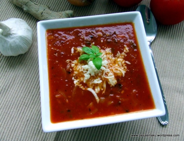 Dzisiaj przepis na pomidorówkę. Tak na prawdę to zrobiłem ją pierwszy raz w życiu, nie wiedzieć czemu… bo zawsze przeszkadzała mi domowa „zupa pomidorowa” z rosołu, który został… tak na prawdę wkurzające było to, że smakowało to jak rosół zakolorowany kawałkiem pomidora. Na to nie mogę pozwolić i pokazuje tutaj jak moim zdaniem powinna być przyrządzana taka zupka. Oczywiście dodałem też coś od siebie dla podbicia smaku, ale nie jest to konieczne – jeśli ktoś nie lubi imbiru nie musi go dodawać.