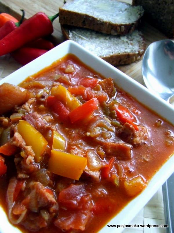 - W garnku rozpuszczamy smalec, przesmażamy na nim pokrojony w kostkę boczek i kiełbasę w półplasterkach. Dodajemy posiekaną w piórka cebulę. Kiedy cebula się zeszkli dodajemy do garnka mieloną słodką paprykę i mieszamy (uwaga, żeby papryka się nie przypaliła bo będzie gorzka). Teraz wrzucamy pokrojoną w paski paprykę (oczywiście oczyszczoną) i posiekaną papryczkę chili (również oczyszczoną).
