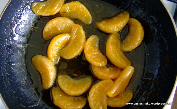 - Podsmażamy na patelni mandarynki (oczywiście umyte i obrane) z dodatkiem cukru i syropu klonowego (2-3 minuty).