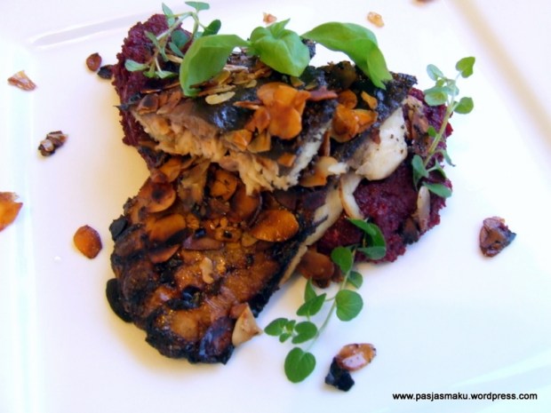 Karp w migdałach z purée z buraka i suszonych śliwek