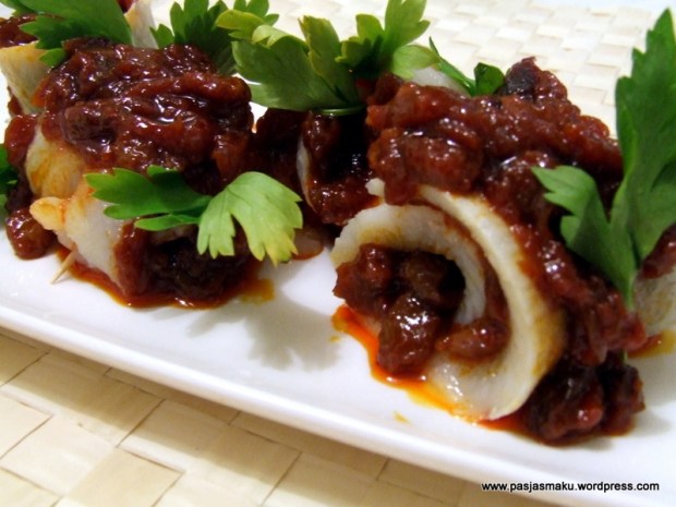 - Posiekany czosnek i pokrojone w piórka cebule przesmażyć na oleju (całe 100ml ponieważ sos ma być mieszaniną z olejem). Dodać rodzynki (dobrze jest je namoczyć ok. 15 minut wcześniej) i przesmażać kilka minut razem. Na koniec dodajemy koncentrat pomidorowy i cukier. Mieszamy dokładnie i smażymy\podgrzewamy na średnim ogniu do momentu aż sos stanie się ciemno-czerwony od karmelizującego się cukru. Doprawiamy do smaku solą i pieprzem.