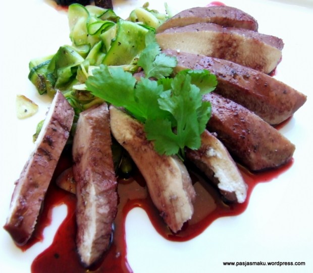 - Kolejne bardzo proste i przepyszne danie. Do rondelka wlewamy wodę, wsypujemy kwiaty hibiskusa i gotujemy aż całość nabierze ciemno – czerwonego koloru (około minuty). Do „bulgoczącego” wywaru wkładamy przyprawiony solą i pieprzem filet z piersi kurczaka i gotujemy ok. 10 minut na mniejszym ogniu (wtedy mięso nie będzie suche, a spokojnie zdąży nabrać koloru). W tym czasie z umytej cukinii robimy płatki a’la tagliatelle (najlepiej robić to obieraczką do warzyw).
