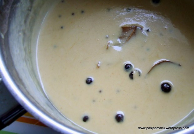 • Delikatnie prażymy w rondelku wszystkie przyprawy (ziele angielskie, kolendrę, liście laurowe) i podlewamy winem.