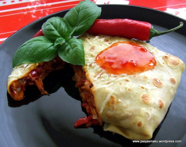 - Tak przygotowanego naleśnika możemy posypać startym serem i zapiekamy w piekarniku nagrzanym do 180 stopni aż do momentu, kiedy ser się roztopi. Dodałem również sos chili „tajskie dziedzictwo”. Niebo, a właściwie… piekło w gębie. Polecam gorąco.