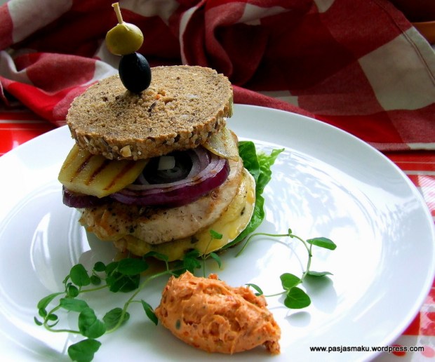Moda na burgery jest ostatnio coraz większa, a to wiąże się z nowymi pomysłami kucharzy. Dzisiaj proponuję coś nowego, bez pszennej bułki z sezamem, bez wołowiny – jednym słowem z klasycznego burgera jest tylko człon nazwy :). Smak – dla mnie genialny. Świetnie komponujące się smaki, uwalniające się wprost proporcjonalnie do każdego kęsa. Po zjedzeniu jednego od razu miałem ochotę przygotować sobie kolejnego – pychota.