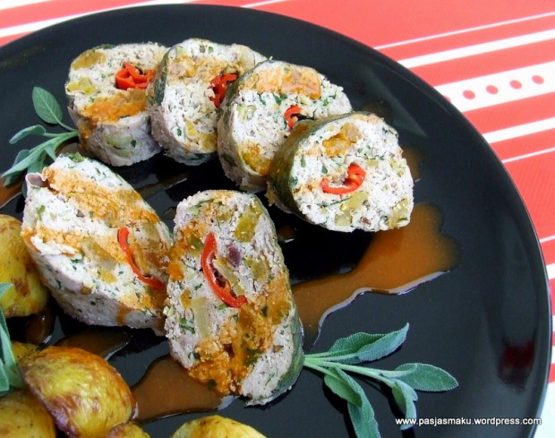 Kiedyś w internecie oglądałem program gdzie Gordon Ramsay przyrządzał właśnie taką roladkę. Składniki, które używał do mięsa wieprzowego bardzo mnie zainteresowały, a ponieważ ja lubię takie niecodzienne połączenia to postanowiłem wypróbować ten przepis na swoim podniebieniu i zdać Wam relacje. Zamiast ostrej kiełbaski do środka dodałem świeżą papryczkę chili (chociaż na pewno z kiełbaską smak jest równie wyśmienity). Przygotowanie nie wymaga wiele czasu, a smak i aromat jest na prawdę obłędny.