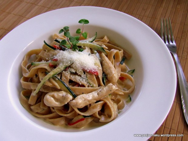 Dzisiaj na talerzu zagości kolejny przepis na makaron 🙂 Jak zwykle szybki, prosty i bardzo smaczny. Od jakiegoś czasu na swoją kolej czekał u mnie dość dorodny kabaczek i jego część doczekała się kuchennej obróbki (z pozostałej części napewno przygotuję coś na dniach). Połączenie znanych nam smaków daje danie wprost idealne na obiad czy kolację.