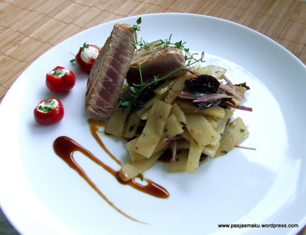 - Tuńczyka oprószamy solą i pieprzem.