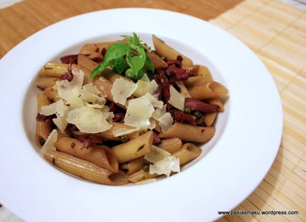 Kolejny przepis na makaron, prosty i pyszny… śródziemnomorskie smaki… ekskluzywne smaki… posmak czerwonego wina… tego koniecznie trzeba spróbować 🙂