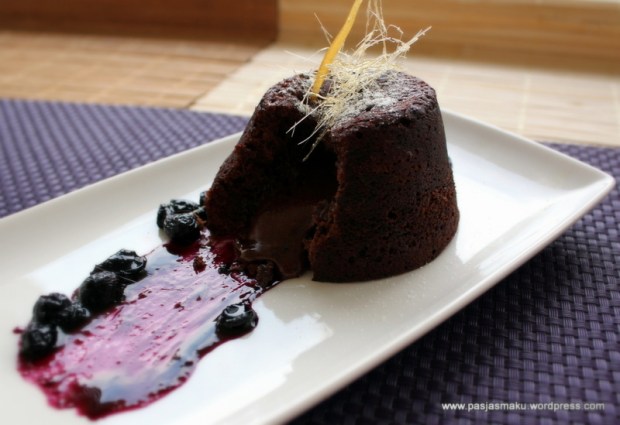 - Gotowy fondant powinien mieć na wierzchu delikatną, chrupiącą, łatwo wyczuwalną skorupkę (coś w rodzaju biszkoptu). Kładziemy na talerzu do góry nogami i wyjmujemy z kokilki. W zależności od foremki w jakiej piekliśmy nasz deser można spowrotem go odwrócić „skorupką” do góry, u mnie nie miało by to porządanego wyglądu dlatego chrupiąca część pozostaje pod spodem.