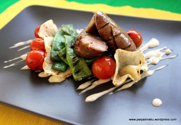 - Kalarepę kroimy w cienkie plasterki, solimy i grillujemy na patelni razem z kiełbasą po minucie z każdej strony.