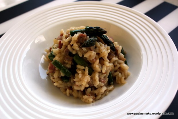 - Kiedy ryż wchłonął już mniej więcej połowę ostaniej porcji bulionu dodajemy chrzan i białą kiełbasę ze szparagami. Mieszamy i czekamy aż risotto będzie odpowiednio ugotowane (wchłonie całość bulionu).