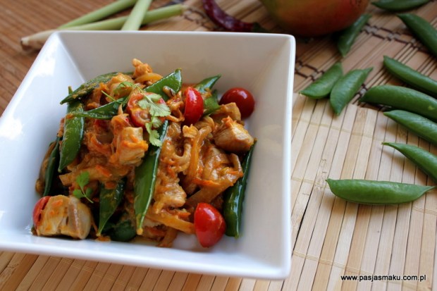 - Na dobrze rozgrzanej z olejem sezamowym patelni smażymy na złoty kolor koguta, dodajemy pokrojoną w cienkie plastereczki trawę cytrynową (najlepiej samą środkową część), groszek, marchewkę szlotkę i kumin (żeby lekko się podgrzał i dał więcej aromatu) powinno to trwać 3-4 minuty.