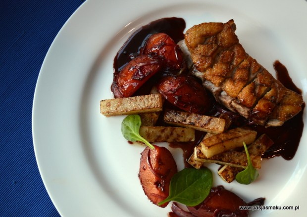 - W międzyczasie podsmażamy na maśle posiekaną w piórka szalotkę z anyżem. Dodajemy pokrojone w ćwiartki śliwki, miód i karmelizujemy. Następnie redukujemy z czerwonym winem i kremem balsamicznym do konsystencji sosu.