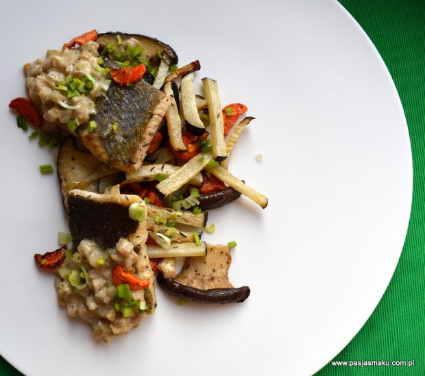 Delikatna ryba, lekka sałatka z warzyw na ciepło i grzyby! Czego chcieć więcej?