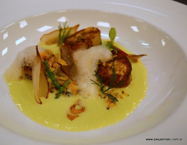 Warm up our pickled cucumber water to 55 degrees and add a lecithin. Mix it to spume. - Przegrzebki smażymy na dobrze rozgrzanej patelni z masłem i oliwą z oliwek po około minucie z każdej strony na złoty kolor. Doprawiamy solą i pieprzem.