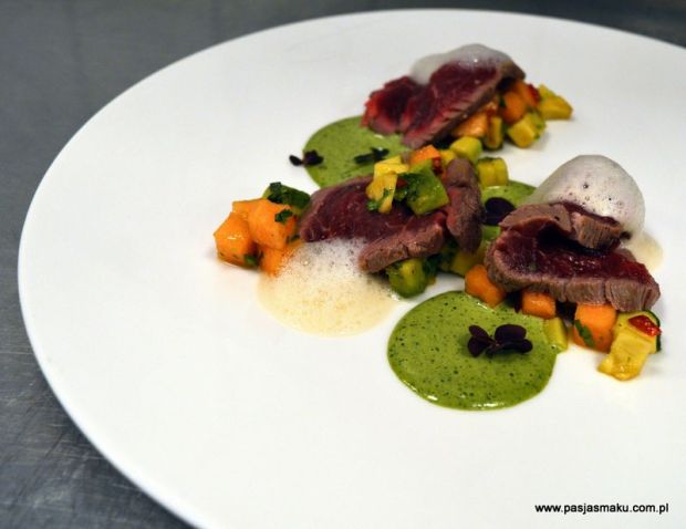 Season a tenderloin with a salt, pepper and fry for each side to golden colour. Get the bowl and put there a bison grass, crushed juniper, żubrówka and our fillet. Set this whole on fire and cover to smoke a tenderloin and give beaty flavours. Slice the beef. - Melona i avocado kroimy w kostkę. Dodajemy posiekany ząbek czosnku, chili i kolendrę. Doprawiamy solą, pieprzem, oliwą z oliwek i sokiem z limonki.
