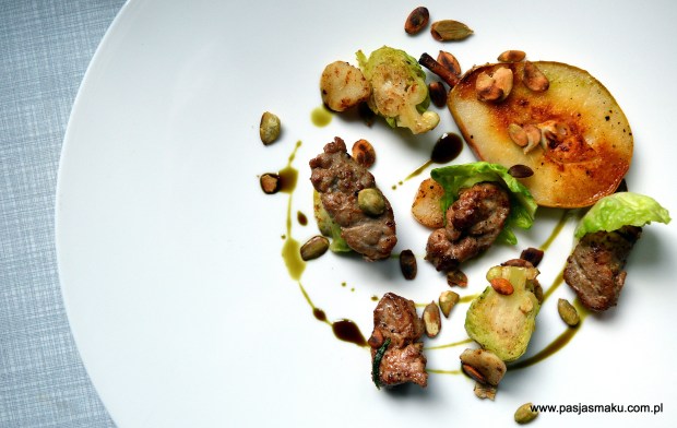 Cleanse veal thymus from membranes, cut and rinse with cold water. Fry veal on hot pan with butter, rosemary and garlic for 2-3 minutes. Season with salt and pepper. - Gruszkę doprawiamy solą i pieprzem, karmelizujemy na suchej patelni do złotego koloru.
