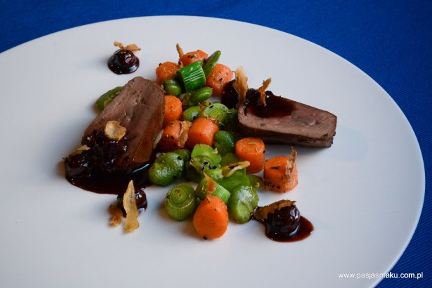 Husk broad bean and fried it on butter with carrot and sliced leek for 3-4 minutes. Season with salt, pepper and fresh rosemary. - Wiśnie w syropie redukujemy z miodem. Doprawiamy pieprzem i łączymy z zimnym masłem do konsystencji sosu.