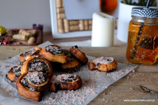 Sprinkle puff pastry with rose petals sugar and spread with jam. Roll pastry and let them rest in a fridge for an hour. - Kroimy całość na 15 równych części i układamy na papierze do pieczenia. Pieczemy w piekarniku rozgrzanym do 200 stopni przez 15-20 minut.