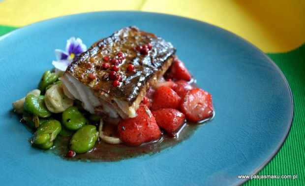 Jak wakacje to ryba, jak ryba to najlepiej kojarzy mi się dorsz – soczysta polędwica z chrupiącą skórką. Do tego niedawno pojawił się bób, który uwielbiam, a w towarzystwie czosnku i czarnuszki daje niesamowite efekty. Wszystko dopełniają truskawki prawie, że stir-fry z aromatem lawendy i brazylijskiego pieprzu. Spróbujcie koniecznie, bo warto ! 🙂