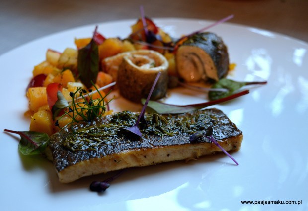 If I think holidays, I say fish. If I say fish, I think about cod – juicy loin with crispy skin. Besides the broad bean are recently appeard in shops – I love this taste with fresh garlic and black cumin. All that dish with strawberries in lavender and pink peppercorn make me bliss. Try it really ! 🙂