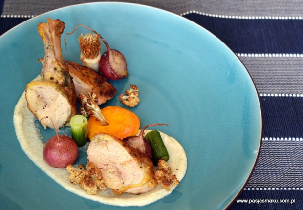 This is not my first time in the kitchen with guinea-fowl, so I want to share my experience with You. Velvety meat, something different than chicken. Perfect with spring and summer vegetables. Today with cauliflower, egg yolk and young vegetables. It is worth!